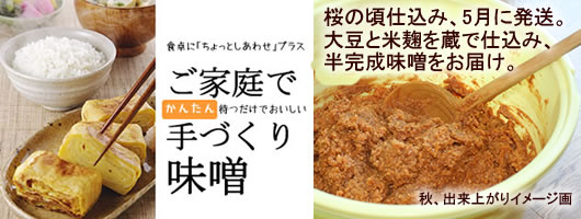 高級味噌(半完成)を「我が家の味」に育ててみませんか。 秋には おいしい「手づくり味噌」が出来上がります。 この商品は 5月GW明けから発送開始の限定品となります。 味噌を仕込む時期、春に年一回お届けの商品となります。 ご来店ありがとうございます。お得な半完成味噌のご案内です。 山形で桜の咲くころ年に一度限定販売の「ご家庭で熟成させる味噌」の仕込みがはじまります。 商品は 5月連休明けのお届けとなります。 秋ごろにはおいしい味噌ができます。